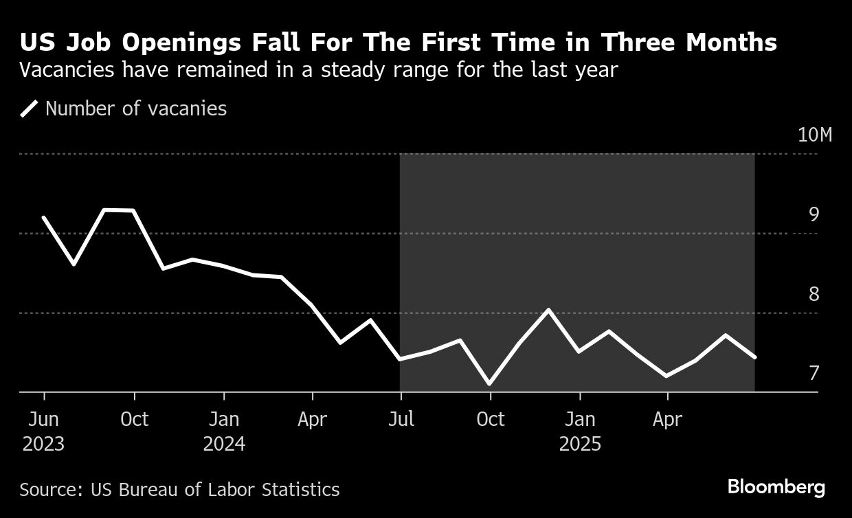 Available positions decreased to 7.44 million from a revised 7.71 million reading in May, according to Bureau of Labor Statistics data published Tuesday. The median estimate in a Bloomberg survey of economists called for 7.5 million openings.