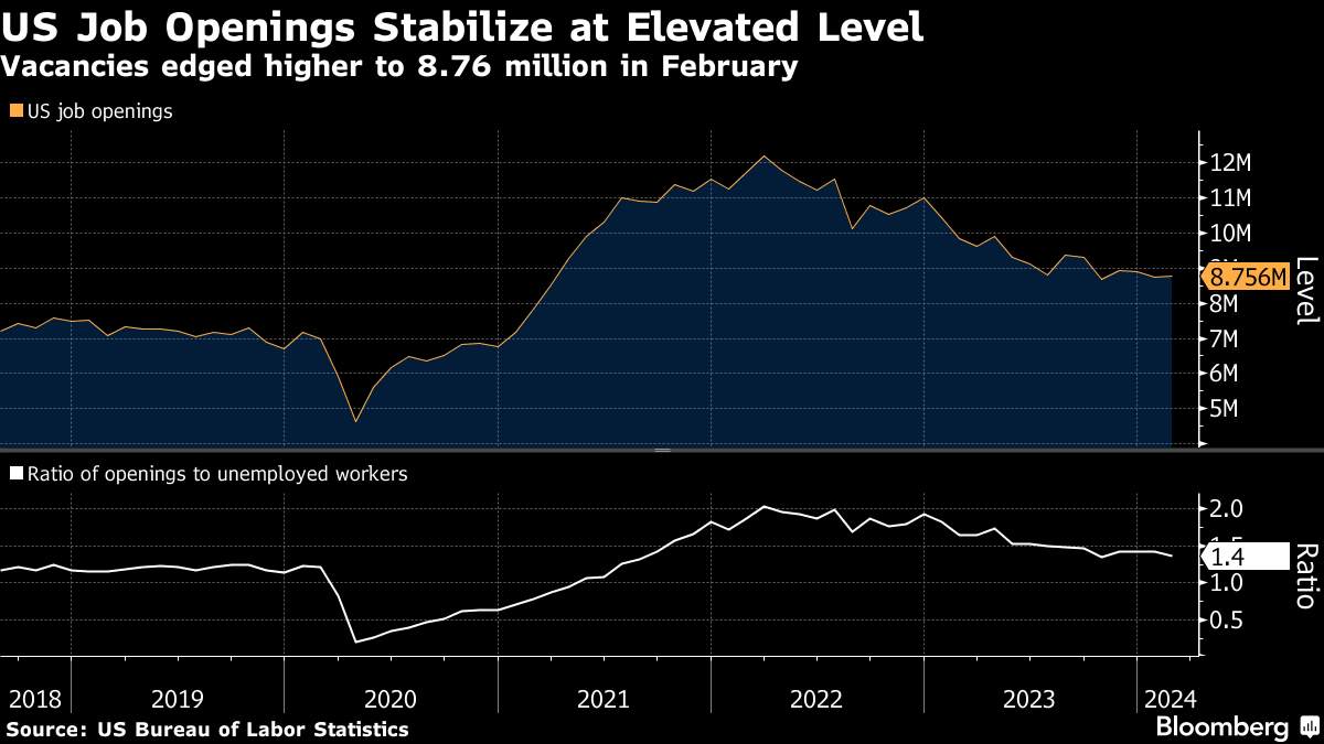 (Bloomberg) -- US job openings were little changed in February from the prior month, suggesting labor demand is stabilizing at an elevated level.
