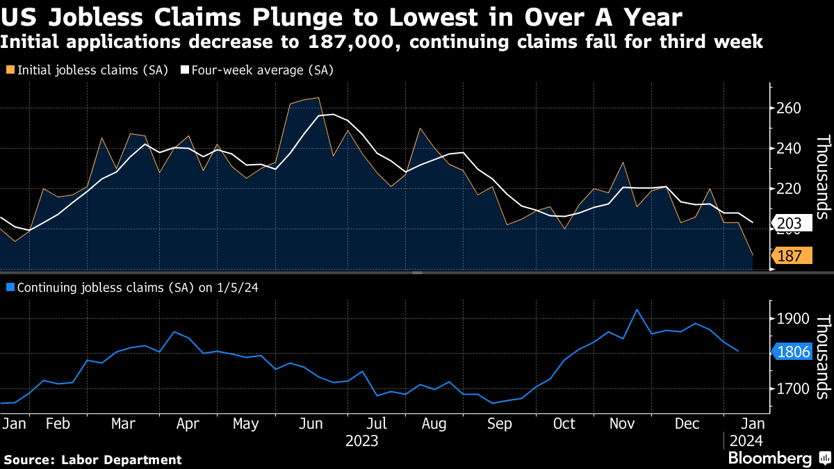 Initial claims decreased by 16,000 to 187,000 in the week ending Jan. 13, according to Labor Department data released on Thursday. The figure was below all estimates in a Bloomberg survey of economists.