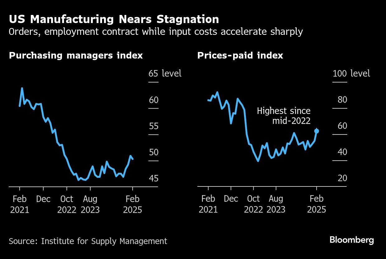 US factory activity last month edged closer to stagnation as orders and employment contracted, while a gauge of prices paid for materials surged to the highest since June 2022 as tariff concerns mounted.
