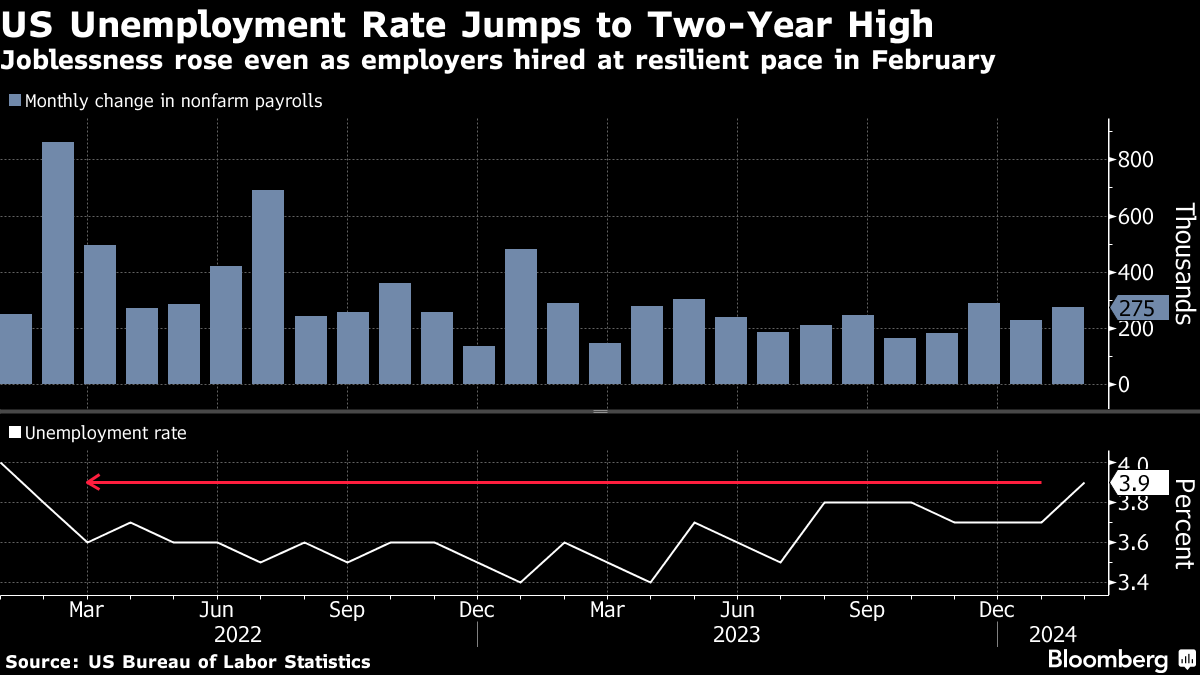 The US jobless rate climbed to a two-year high in February even as hiring remained healthy, pointing to a cooler yet resilient labor market.
