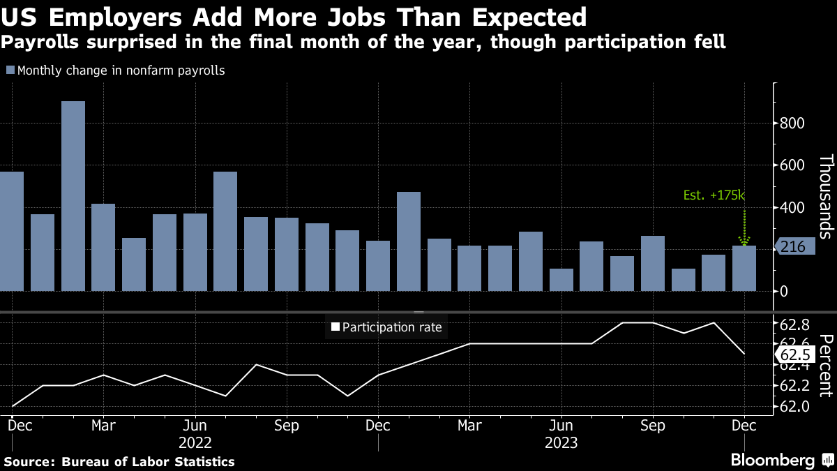 Nonfarm payrolls increased 216,000 after downward revisions to the prior two months, a Bureau of Labor Statistics report showed Friday. The unemployment rate held at 3.7%, while average hourly earnings rose 0.4% from a month earlier.
