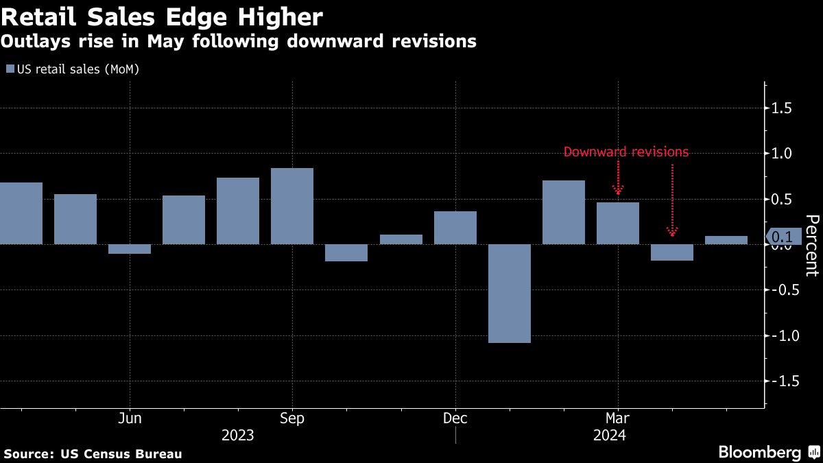 (Bloomberg) -- US retail sales barely rose in May and prior months were revised lower, pointing to greater financial strain among consumers.