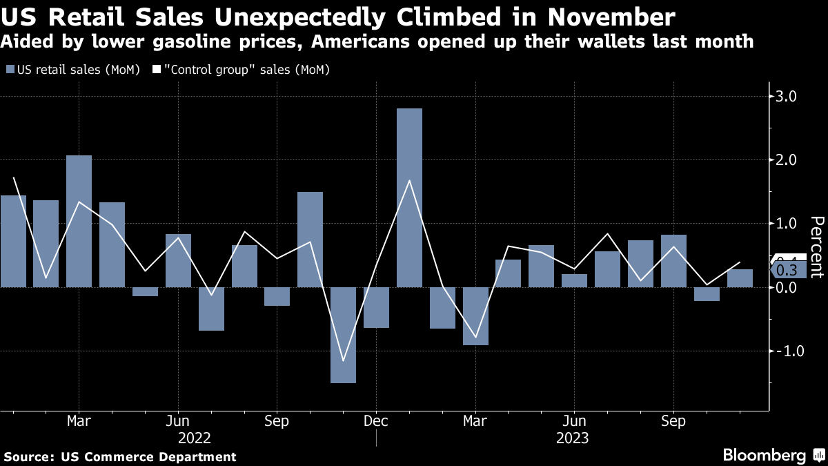 “The robust November retail sales report suggests US consumers continue to prefer to bargain hunt online and are still leaning away from big-ticket and interest-rate sensitive spending categories. In our view, that means while consumers are getting into the spirit of the gift-giving season, they're still feeling the pinch from higher prices and interest rates.”