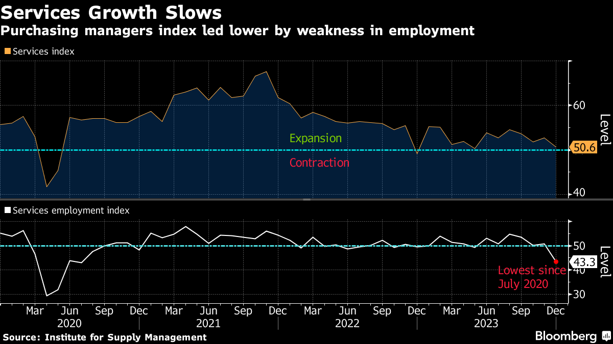 (Bloomberg) -- The US service sector came close to stagnating at the end of 2023 as a gauge of employment showed the biggest contraction in more than three years.