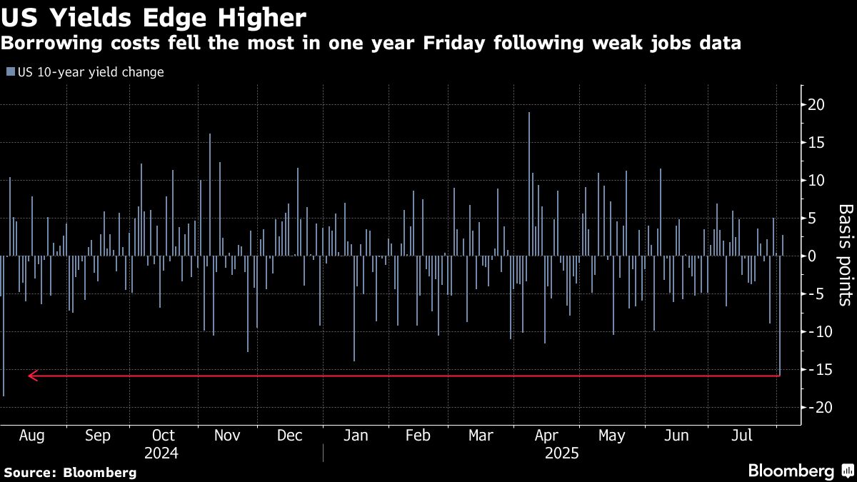 The biggest week for sales of longer government bonds since May could weigh on prices as the Treasury offers $125 billion of new three-, 10- and 30-year notes. For now that's put on hold Friday's surge, which was triggered by surprisingly weak US jobs data and fresh speculation Federal Reserve Chair Jerome Powell will be replaced by someone more willing to aggressively cut interest rates.