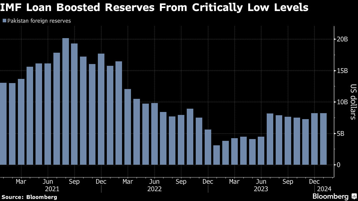 Pakistan has about $1 billion in dollar-denominated bonds due in April. While markets have priced out the risk of default for those notes, the payment will eat into the nation's dollar stockpile, which totaled $8.2 billion in late January. The nation's finances will collapse without a fresh bailout, according to all 12 respondents in a recent Bloomberg survey.