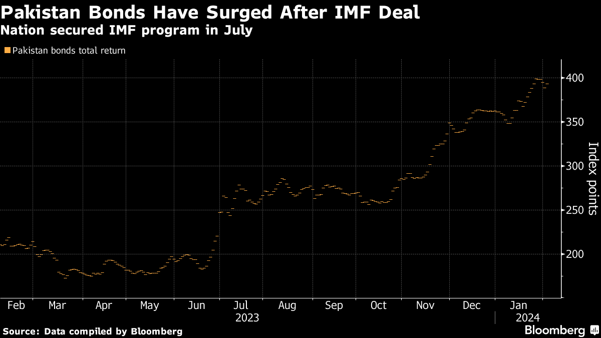 After handing over investors a return of almost 100% in 2023, Pakistan notes gained 9% last month, catapulting them among the best in the world. The stellar performance may take a breather as the South Asian nation votes on Thursday to elect a new government, which may negotiate for a fresh IMF bailout as the current one expires in March.