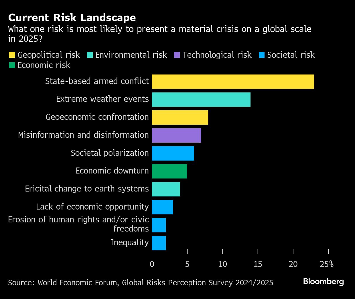 “State-based armed conflict” is the most pressing immediate concern for 2025 cited by about a quarter of the 900 respondents in an annual survey released just days before the organization's elite gathering in the Swiss mountain resort of Davos.