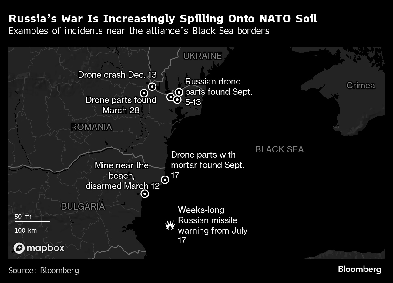 (Bloomberg) -- Ukraine's leader said Russia is attempting to damage hydro power plants, while Romania has found drone fragments near its border with Ukraine from recent Russian air attacks, adding to concerns that Kremlin troops may inflict damage on the territory of a NATO member.