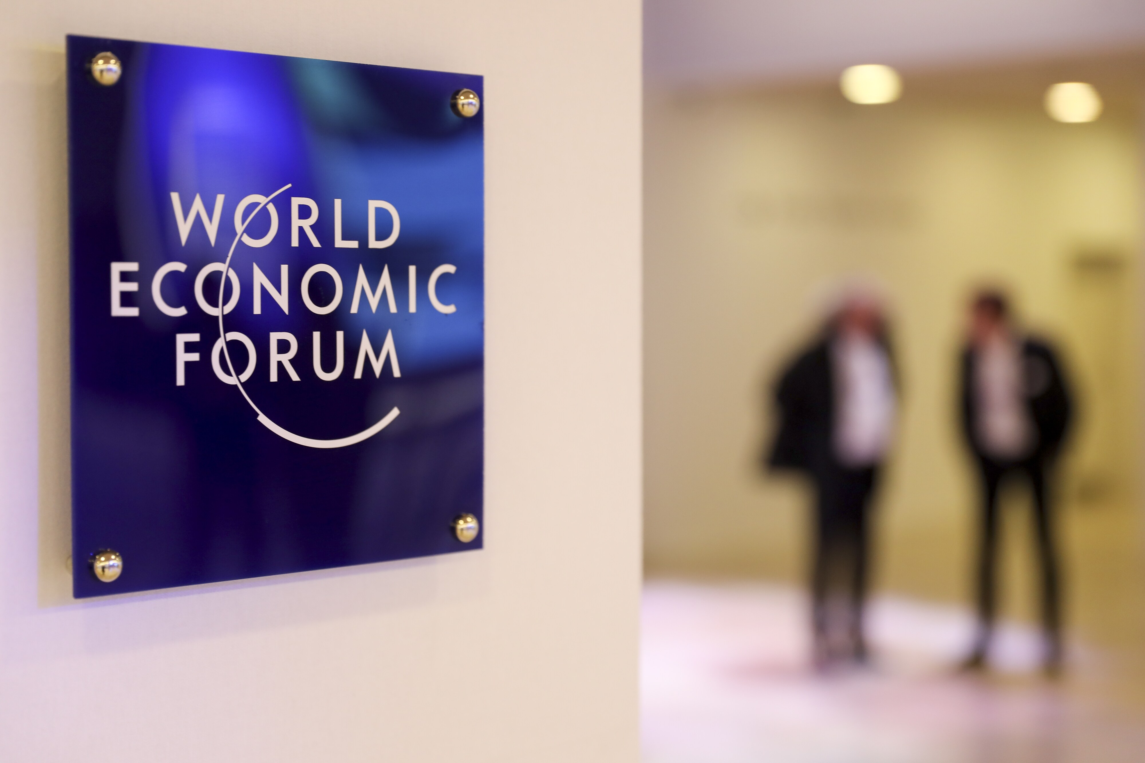 A World Economic Forum sign hangs inside the Congress Center ahead of the World Economic Forum in Davos, Switzerland. (Photographer: Simon Dawson/Bloomberg)