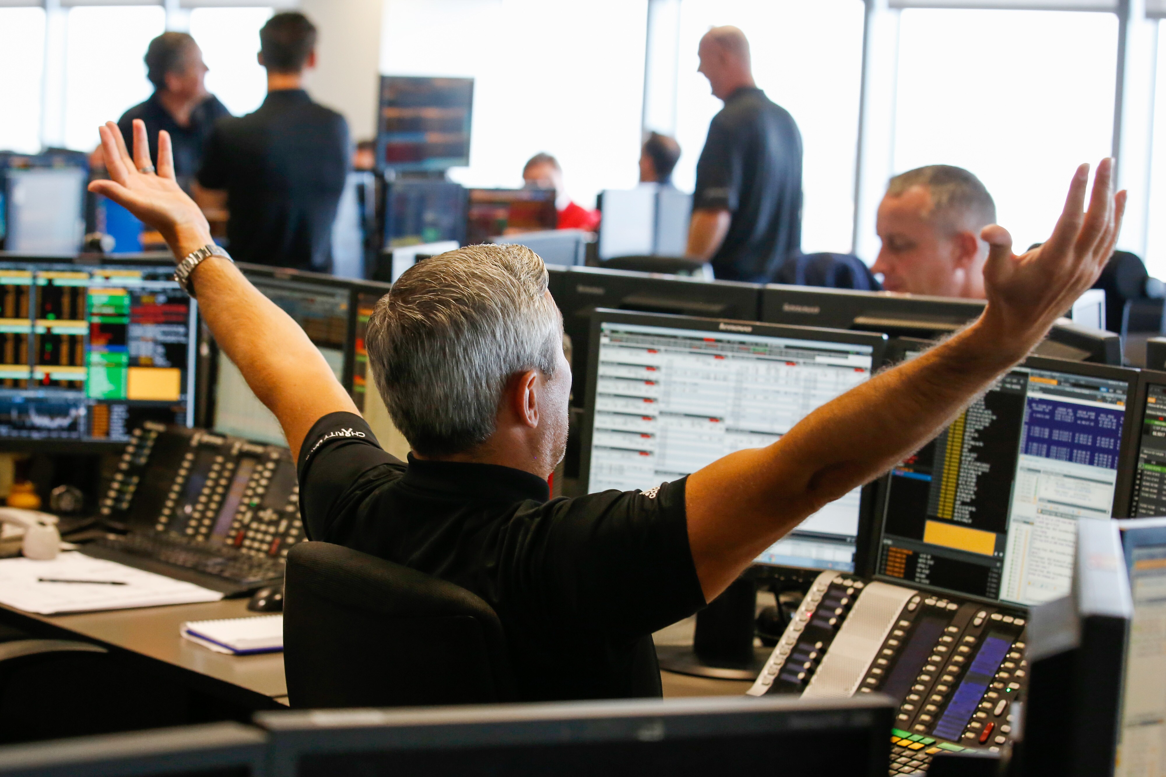 A broker reacts while looking at financial data on computer screens. (Photographer: Luke MacGregor/Bloomberg)