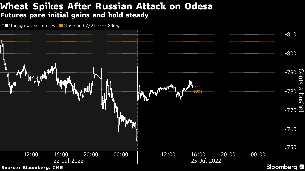 (Bloomberg) -- Wheat prices jumped after Russia attacked the sea port of Odesa with cruise missiles at the weekend, just hours after signing a deal to unblock grain exports from Ukraine, a move that was hailed as a vital step toward alleviating the global food crisis.