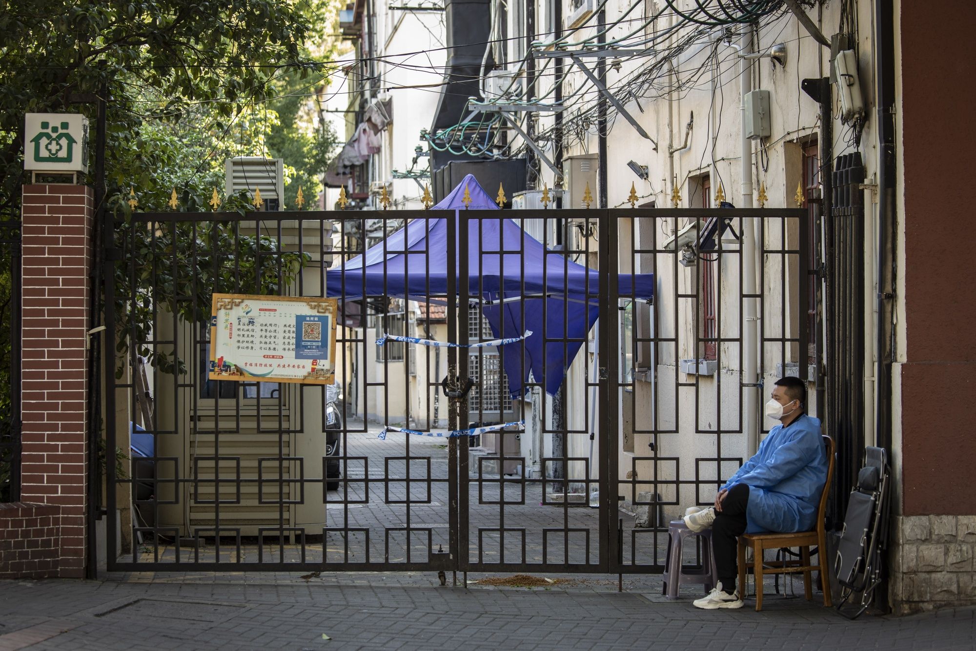 A guard at the entrance to a neighborhood under lockdown in Shanghai. Photographer: Qilai Shen/Bloomberg