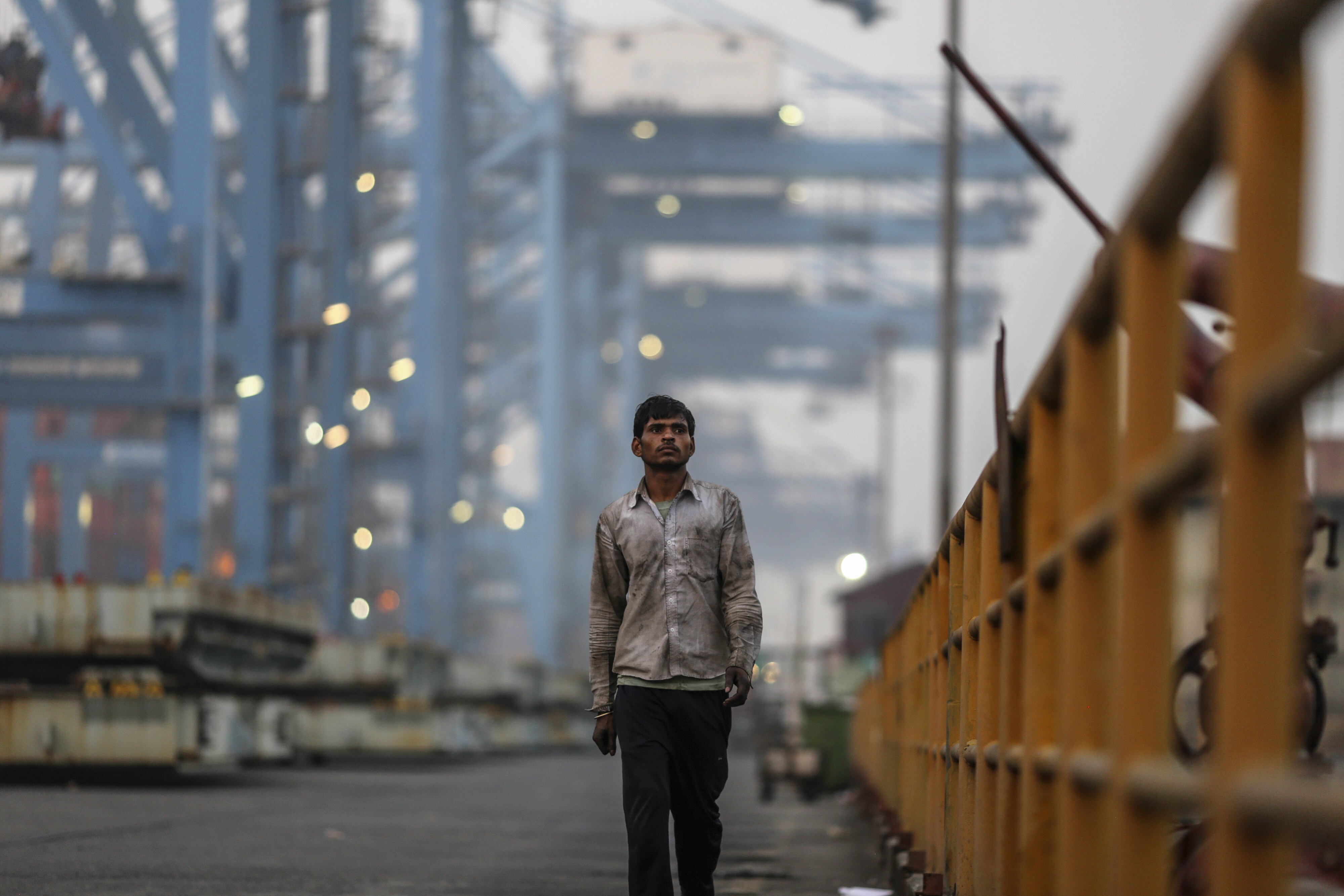 A worker walks past gantry cranes at the Jawaharlal Nehru Port, operated by Jawaharlal Nehru Port Trust (JNPT), in Navi Mumbai. (Photographer: Dhiraj Singh/Bloomberg)