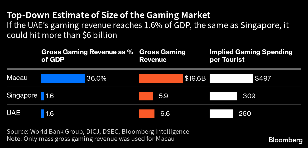 The stakes are high. The UAE could pull in as much as $6.6 billion of gaming revenue annually and eventually surpass Singapore, home to the renowned Marina Bay Sands resort, according to Angela Hanlee, a senior gaming and hospitality analyst for Bloomberg Intelligence.