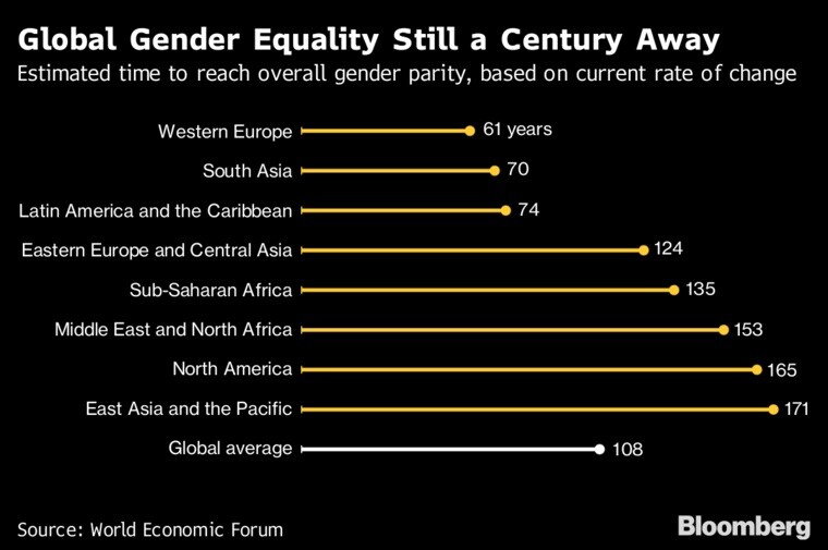(Bloomberg) -- The good news: The global gender gap has improved, slightly. The reality: Differences in economic opportunity, including pay between men and women, are so vast it'll take 202 years to fully bridge them, according to the World Economic Forum.