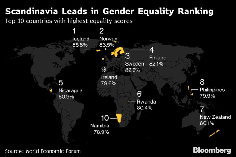 Iceland was the best performer on the list for the 10th year running. It also remained No. 1 for women's political empowerment, although it slid in female representation among legislators, senior officials and managers. In October, Prime Minister Katrin Jakobsdottir was among scores of Icelandic women who walked out of their workplaces to protest wage inequality and sexual harassment. Other nations with female leaders -- New Zealand and the U.K. -- finished seventh and 15th.
