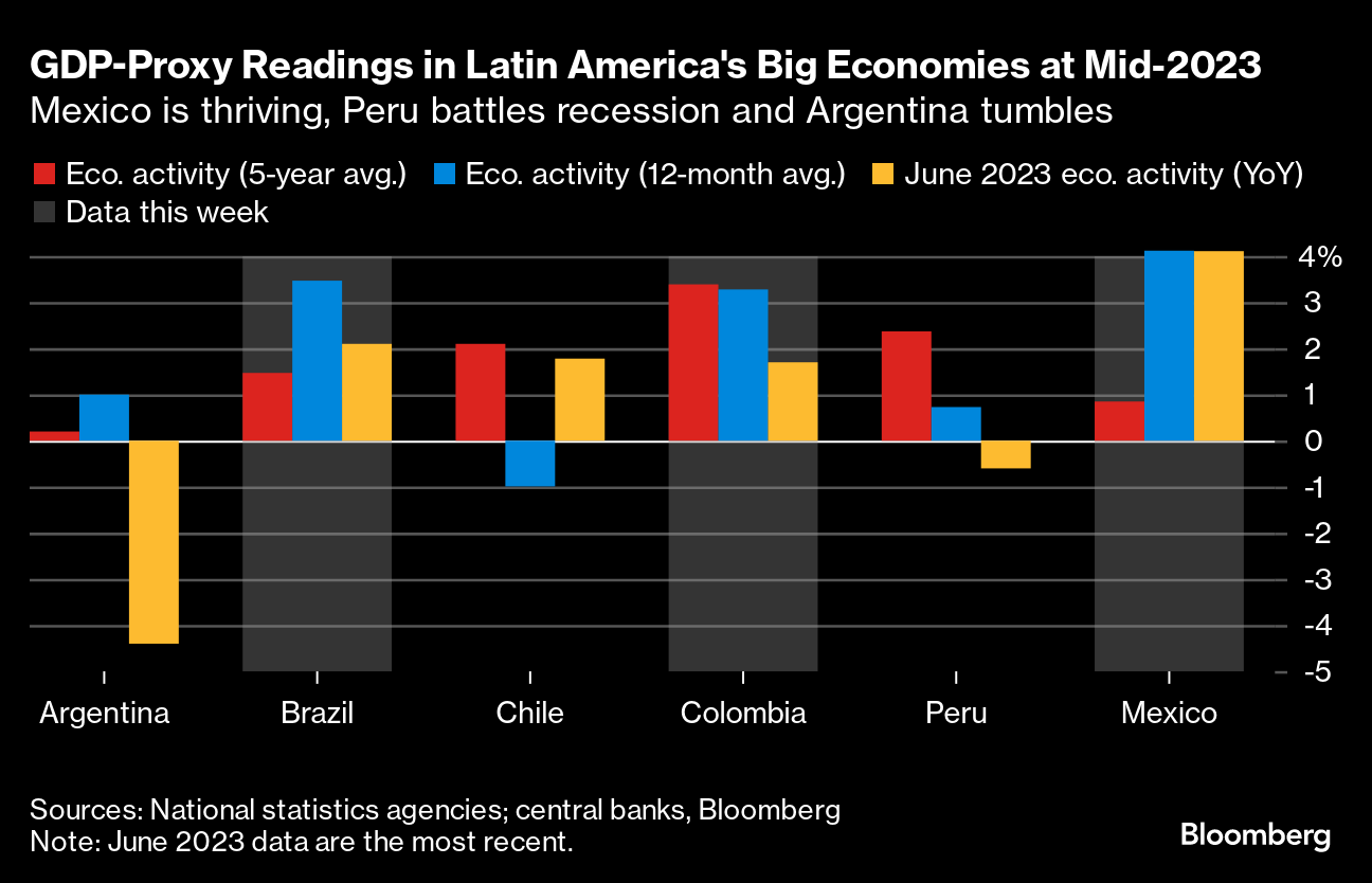 Brazil, Colombia and Mexico all report July GDP-proxy data in the coming week while Argentina posts second-quarter output, the last of the region's big economies to do so.