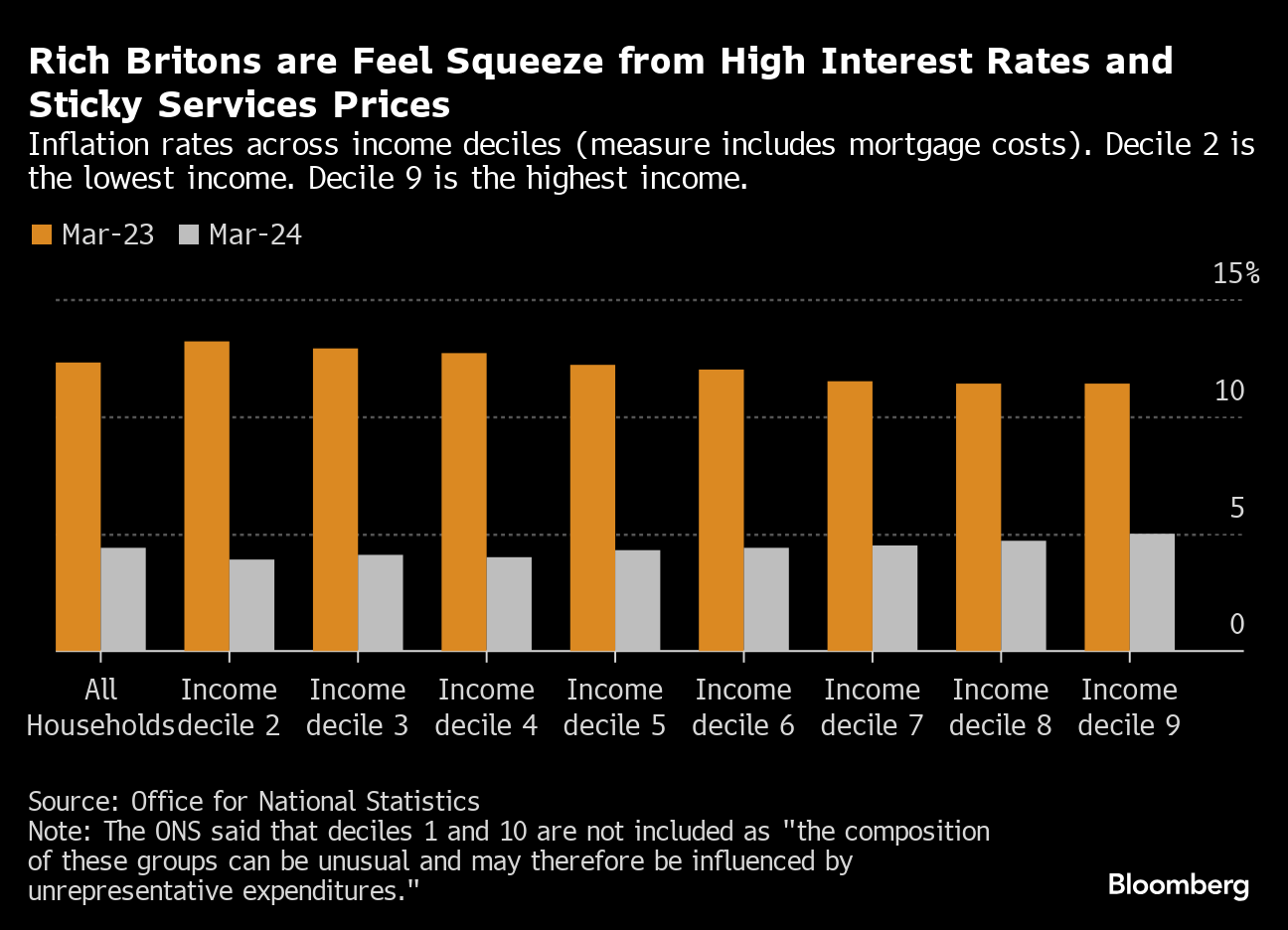 Britain's richest households are experiencing higher rates of inflation than poorer segments of society because of high mortgage costs and rapid price increases in restaurants and hotels. The figures show how the sharp cooling in energy and food inflation has alleviated the pressure on the finances of the worst off in Britain.