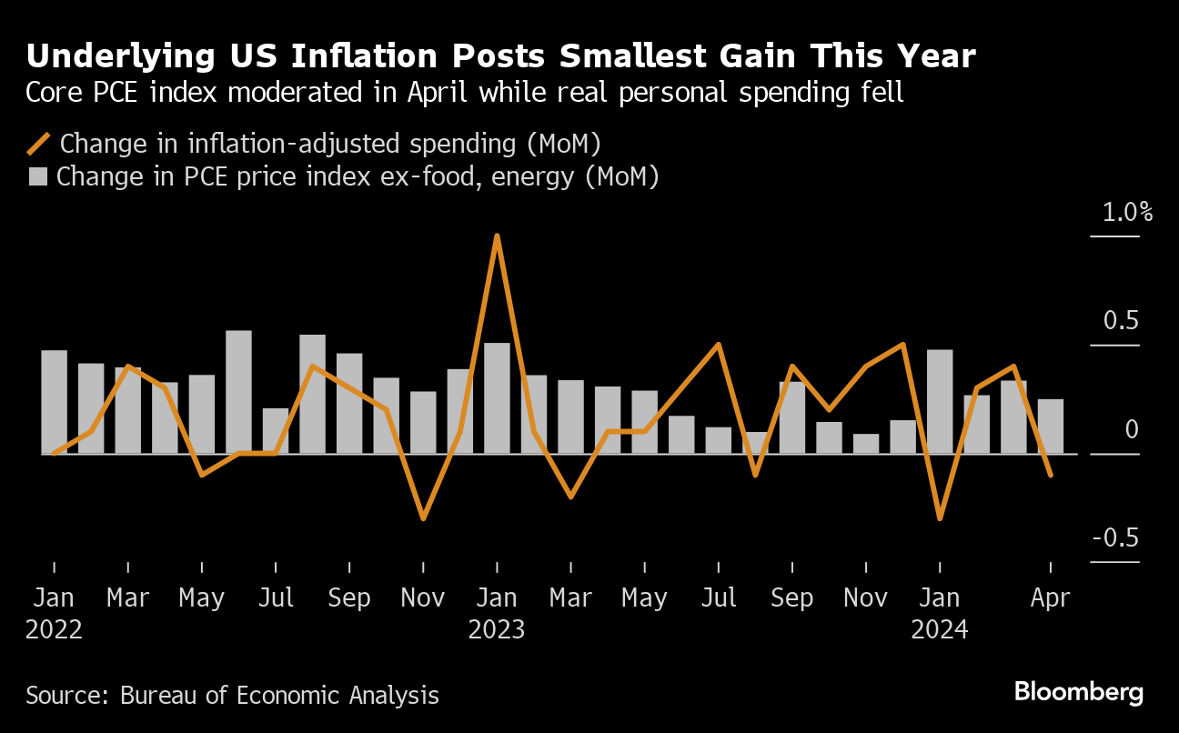 In the US, the Federal Reserve's preferred measure of underlying inflation moderated in April and consumers dialed back their spending, supporting plans for an eventual reduction in interest rates. Swaps traders still expect the Fed to cut rates at least once this year.