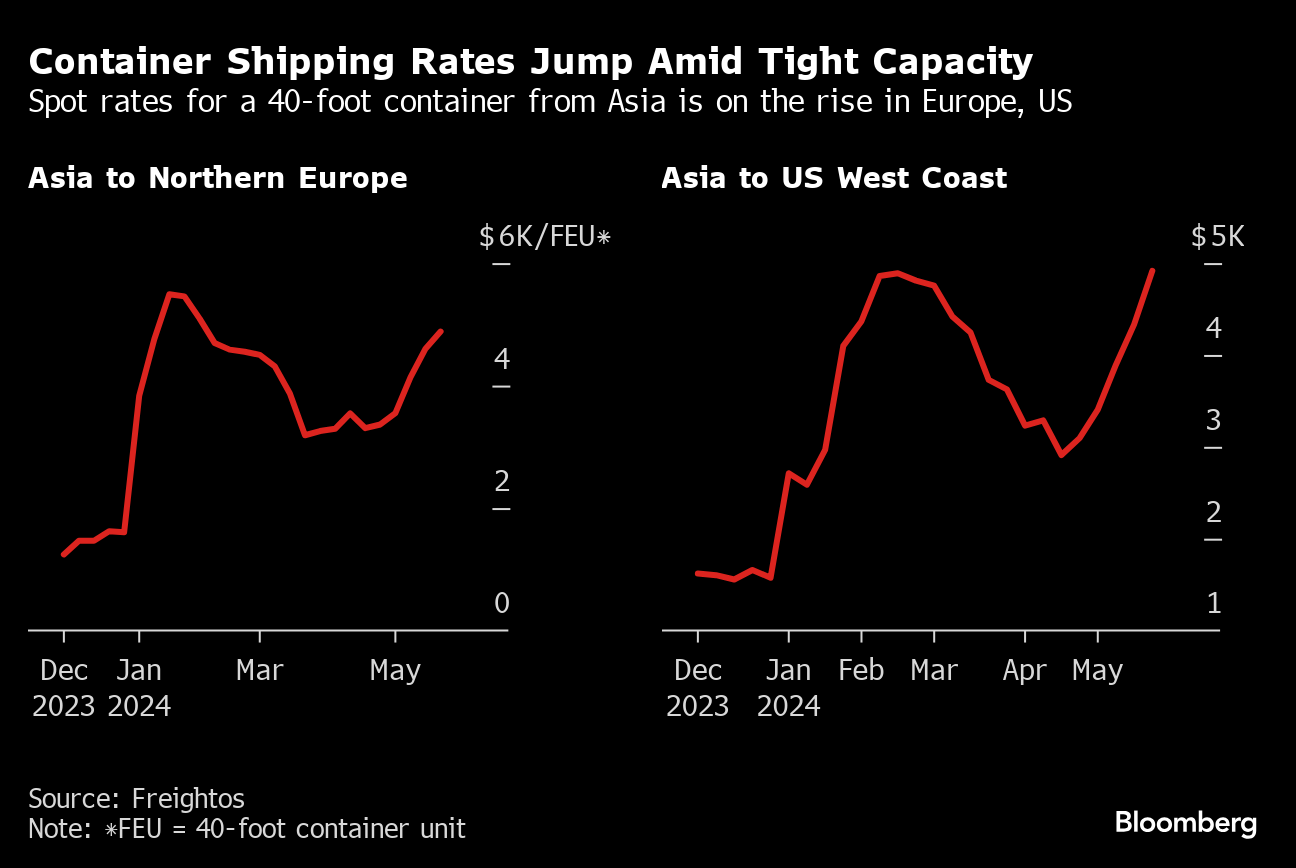 Companies transporting goods from Asia face costs of as much $10,000 for an urgent full-size shipping container over the next month — about double current spot rates, according to prices circulating between carriers and importers. With capacity stretched by more than five months of attacks on vessels in the Red Sea, the container shipping industry is scrambling to meet demand that's picking up in the US and Europe.