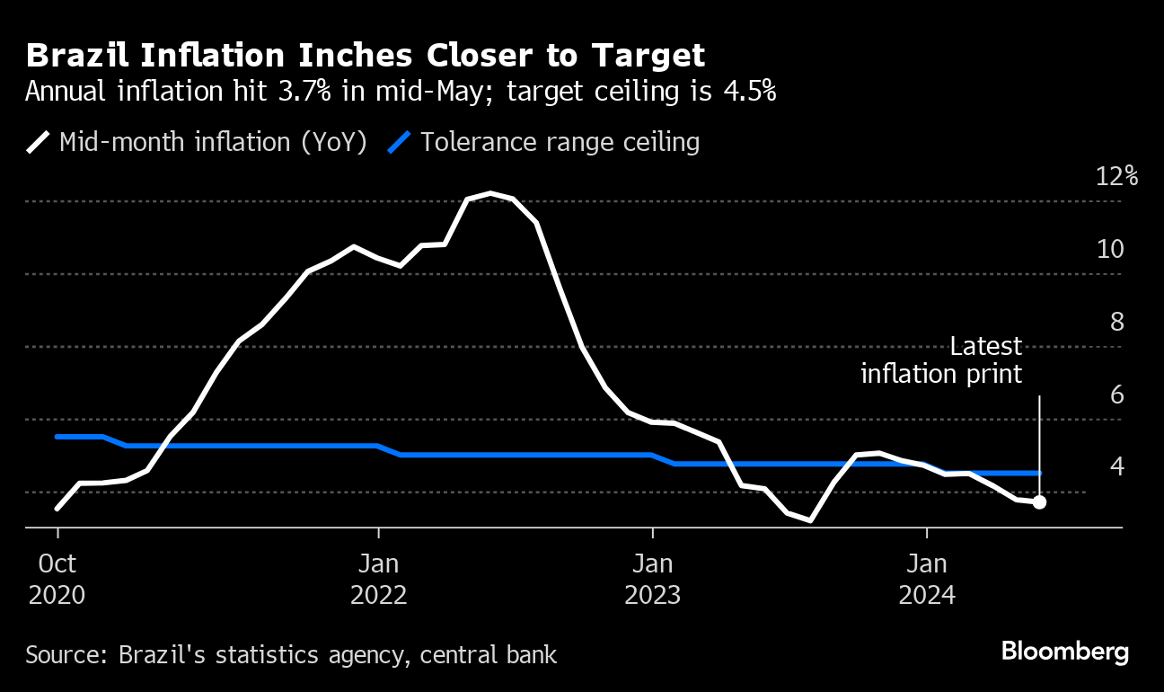 Brazil's annual inflation eased more than expected in early May, adding to economists' expectations that policymakers have enough wiggle room to cut borrowing costs again in June before pausing their easing cycle.
