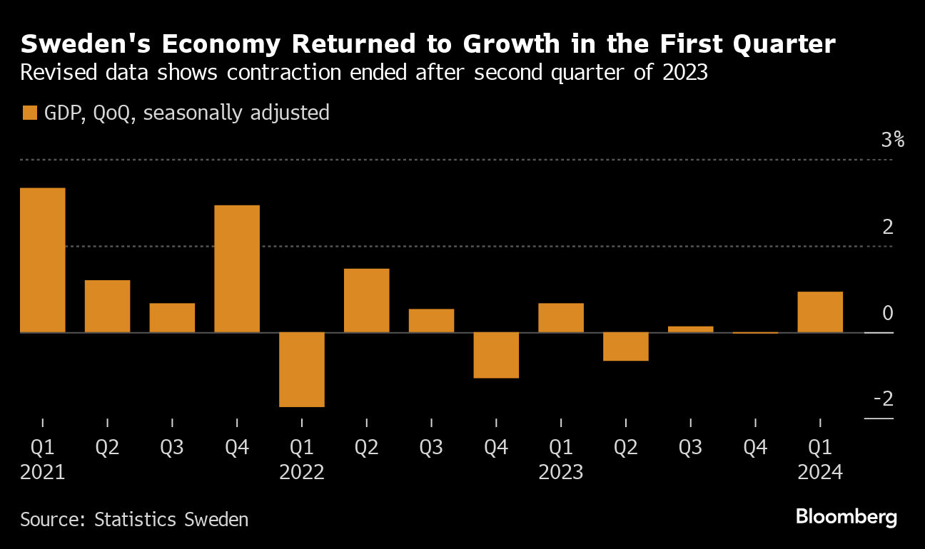 Sweden's economy exceeded forecasts in the first quarter by expanding at the fastest clip in almost two years — helped mainly by higher inventories — as the Nordic country's prospects are brightening with its central bank having started interest-rate cuts. Output for the three previous quarters was also revised higher, meaning there was no technical recession — as defined by two consecutive quarters of falling output — in the past two years.