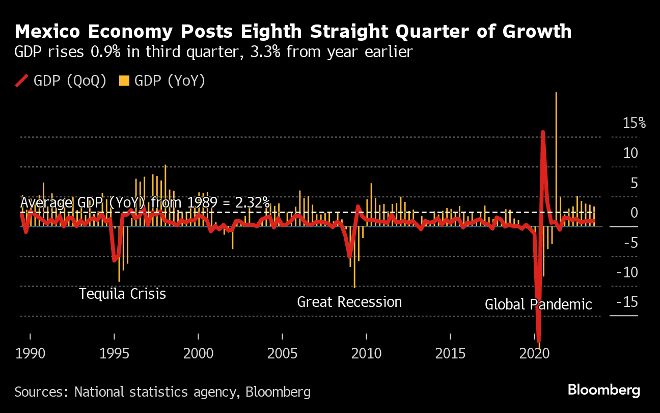Mexico's economy accelerated more than forecast in the third quarter, buoyed by flourishing trade with the US and solid spending by Mexican consumers. Growth in Latin America's second-largest economy is also due in part to extra spending on the part of the government, which has expanded programs and rushed to finish major infrastructure projects before President Andres Manuel Lopez Obrador's term ends in late 2024.