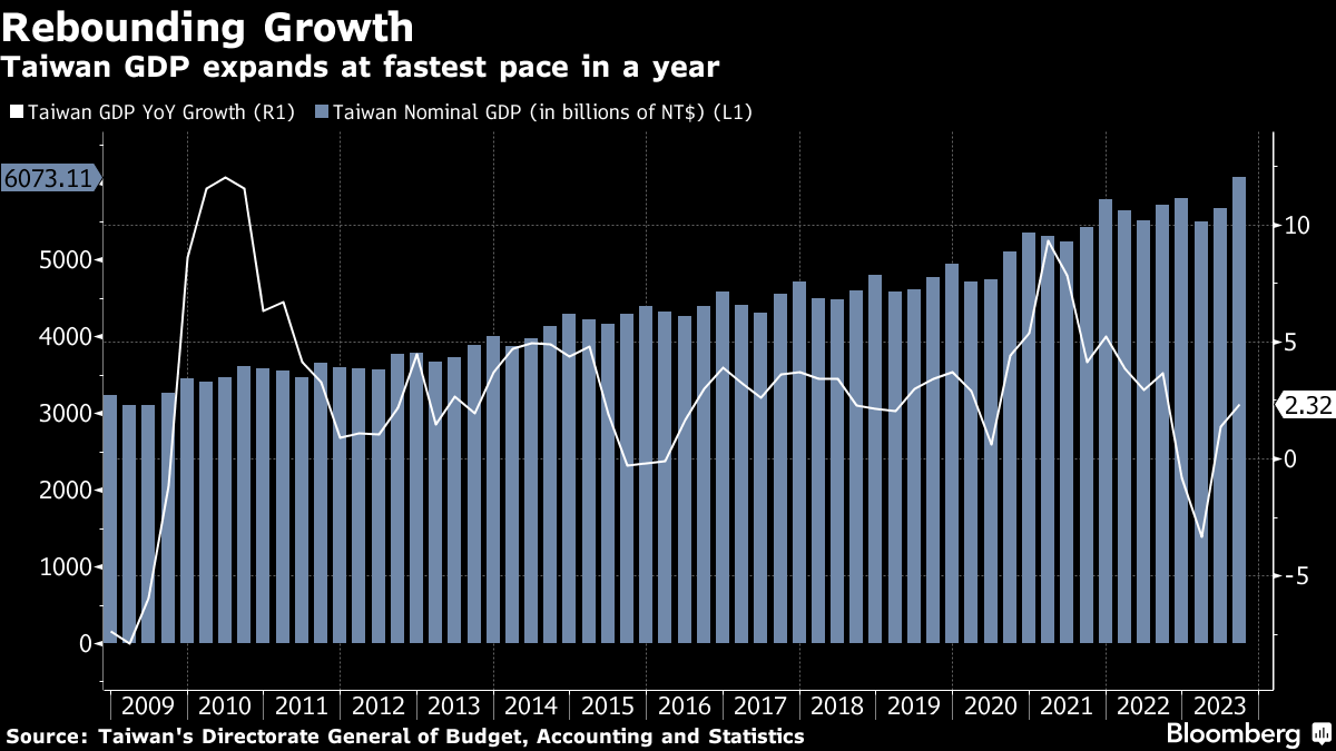 Taiwan's economy grew at the fastest pace in a year as consumer spending continued to rebound, giving the government a much-needed boost before a critical presidential election in January.