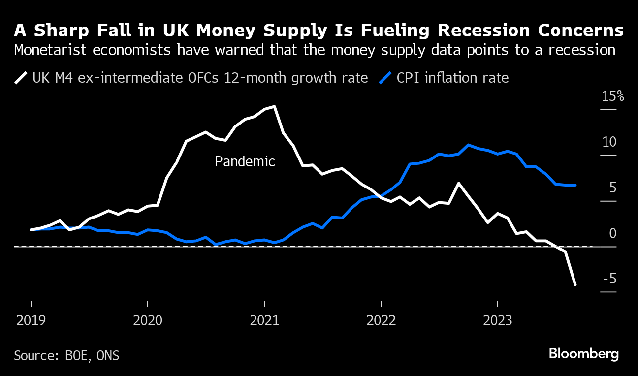 UK housing and money supply data flashed warning signs for the economy, with figures that underscore the impact of a rapid series of interest rate increases from the Bank of England. Banks and building societies authorized the fewest mortgages in eight months, while money supply contracted sharply.