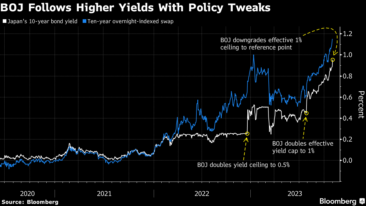 The Bank of Japan has tightly overseen the government debt market since it introduced yield-curve control in September 2016, with its ownership of outstanding bonds surpassing 50%. But with the authority now suggesting it's ready to let the benchmark 10-year yield rise beyond 1%, investors look set to take back the helm.