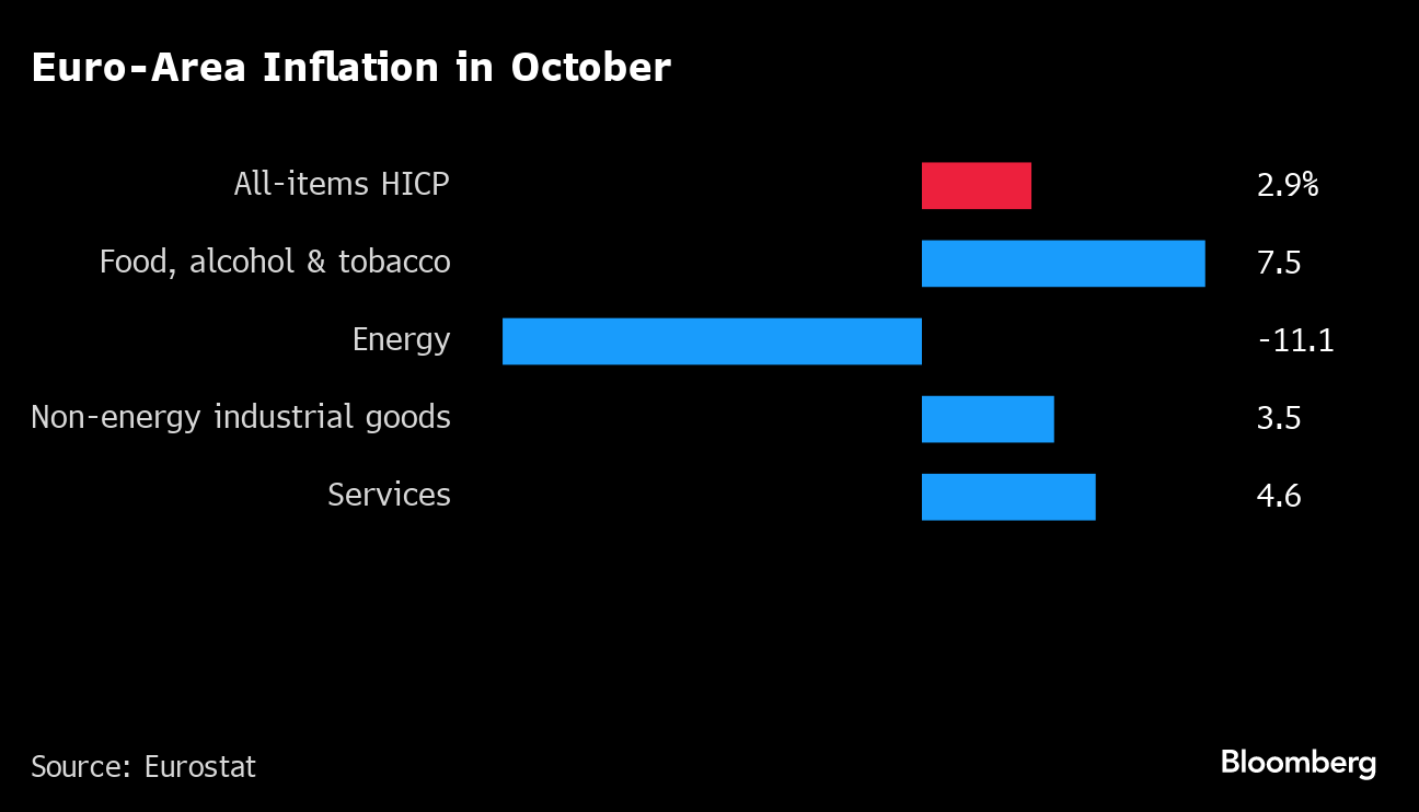 Euro-area inflation eased to its lowest level in more than two years as the bloc's economy shrank following an unprecedented ramp-up in interest rates. The data show that while the European Central Bank's 10 straight hikes are helping to bring inflation back toward the 2% goal, they're also taking a toll on households and firms by sending loan costs sharply higher.