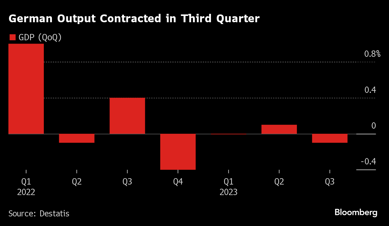 German output shrank in the third quarter — raising the risk that Europe's largest economy is headed for a recession. The data underscore Germany's struggle to bounce back from an energy-induced downturn last winter that was followed by two quarters of stagnation or minimal growth.
