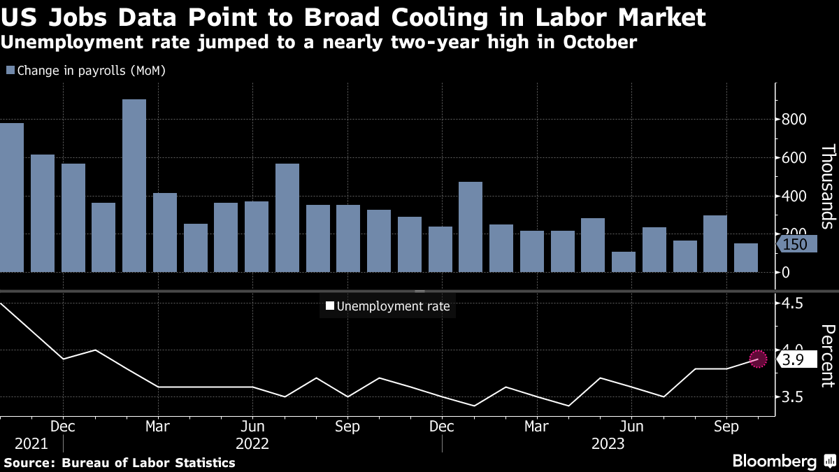 US job growth slowed by more than expected and the unemployment rate rose to an almost two-year high of 3.9%, indicating that employers' strong demand for workers is beginning to cool. The latest figures suggest some cracks are beginning to form in a jobs market that has been gradually normalizing, thanks to an improvement in labor supply over the past year and a tempering in the pace of hiring.
