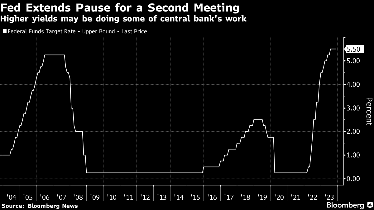 Fed Chair Jerome Powell hinted the central bank may now be finished with the most aggressive tightening cycle in four decades after it held off on raising interest rates for a second consecutive policy meeting.