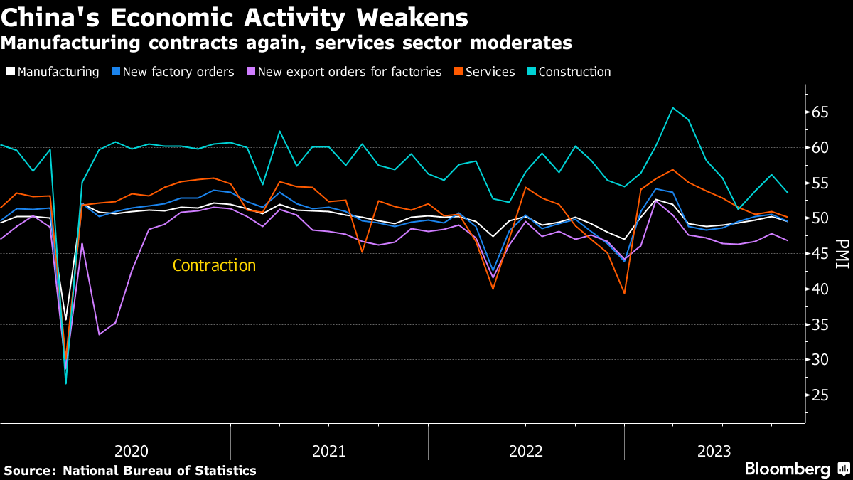 China's factory activity fell back into contraction in October, while services grew at a slower pace than expected, signaling that the economy remains fragile and is in need of support.