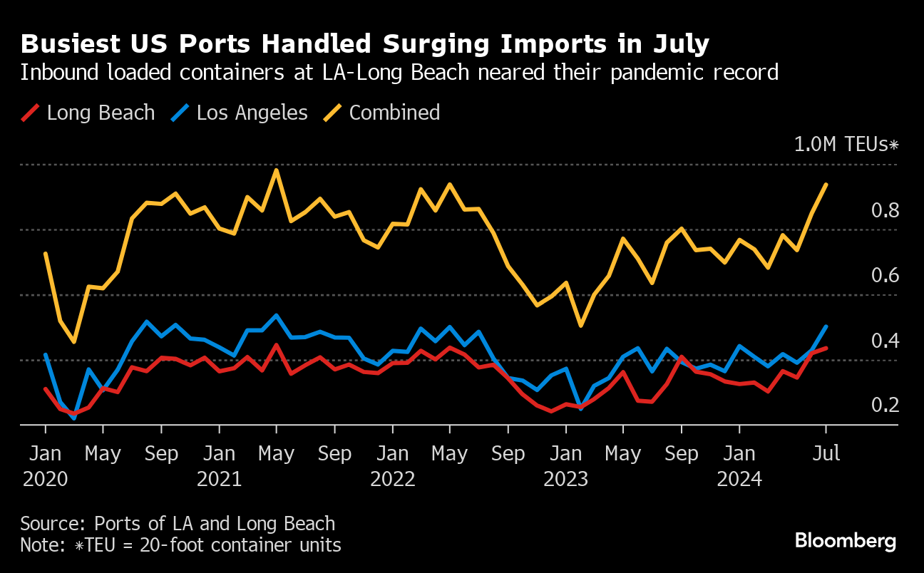 The busiest port complex in the US is churning through import volumes near the highs set during the pandemic despite worries about a cooling economy. Demand now is driven by retailers and other importers that are stocking up ahead of US tariffs on Chinese goods and a possible strike by a large group of American dockworkers — adding to the usual frenzy of pre-holiday ordering that occurs this time of year.