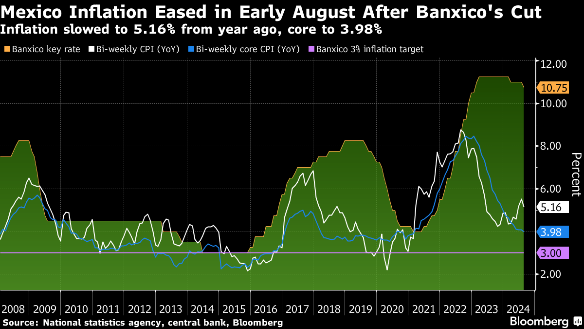 Mexico's annual inflation slowed much more than expected while economic growth remained feeble. The data clear the way for Banxico, as the Mexican central bank is known, to deliver a second-straight rate cut of a quarter-point at its September meeting.