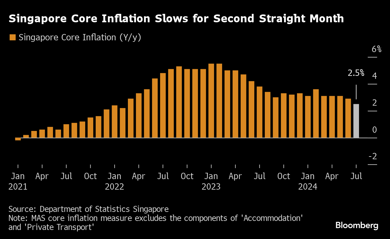 Singapore's core inflation slowed more than expected in July, opening the room for the island's central bank to consider loosening monetary policy settings later this year.