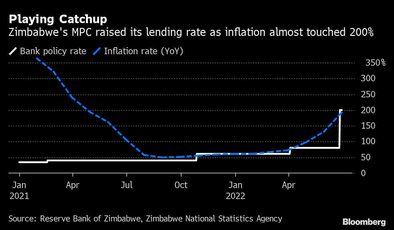 The monetary policy committee more than doubled the key rate to 200% from 80%, Governor John Mangudya said in a statement on Monday. That brings the cumulative increase this year to 14,000 basis points -- the most globally.