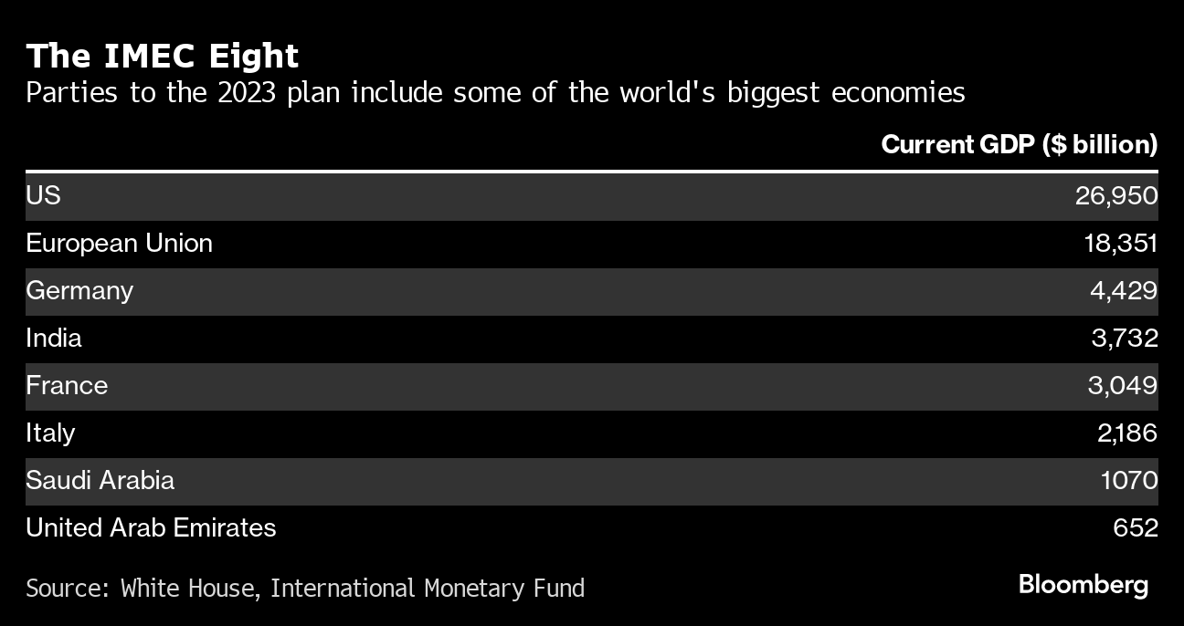 Asked about the timeline for the project, a person familiar with the plans said the outbreak of violence in the Middle East has diverted attention away from discussions on IMEC.