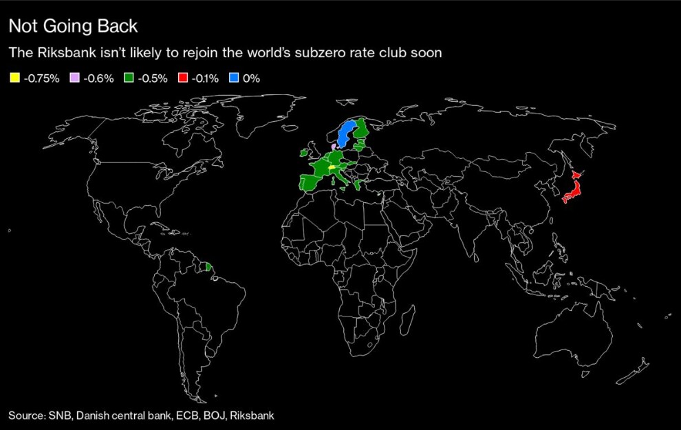 That resolve sets the Riksbank apart from its four global counterparts from Europe to Japan that stuck to the policy, before the Covid-19 crisis then kept them locked into it for the foreseeable future. The Bank of England has since signaled that it won't rule out joining that group, despite the potential harm caused to finance industry profits.