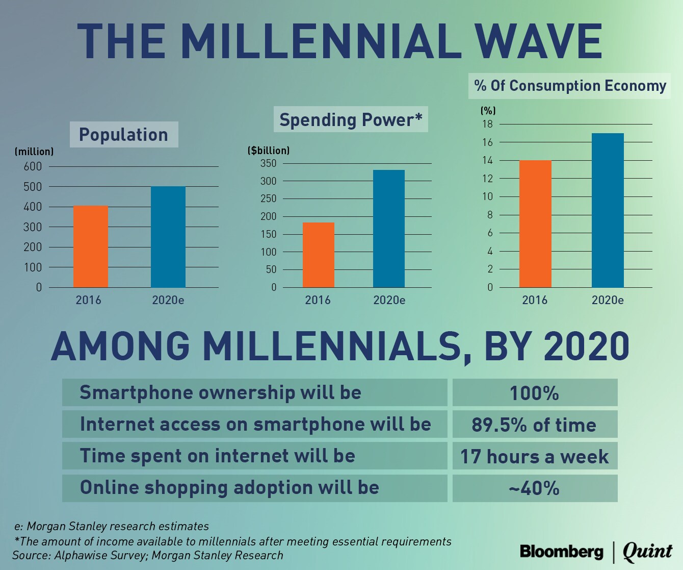 Morgan Stanley estimates India's millennial population (currently aged between 18-35) at 407 million in 2016, the largest in the world, to grow another 100 million by 2020. Out of this, around 80 million would be current millennials, who will be beyond that age bracket, but will be “millennials at heart but not by age”, the global financial major said.
