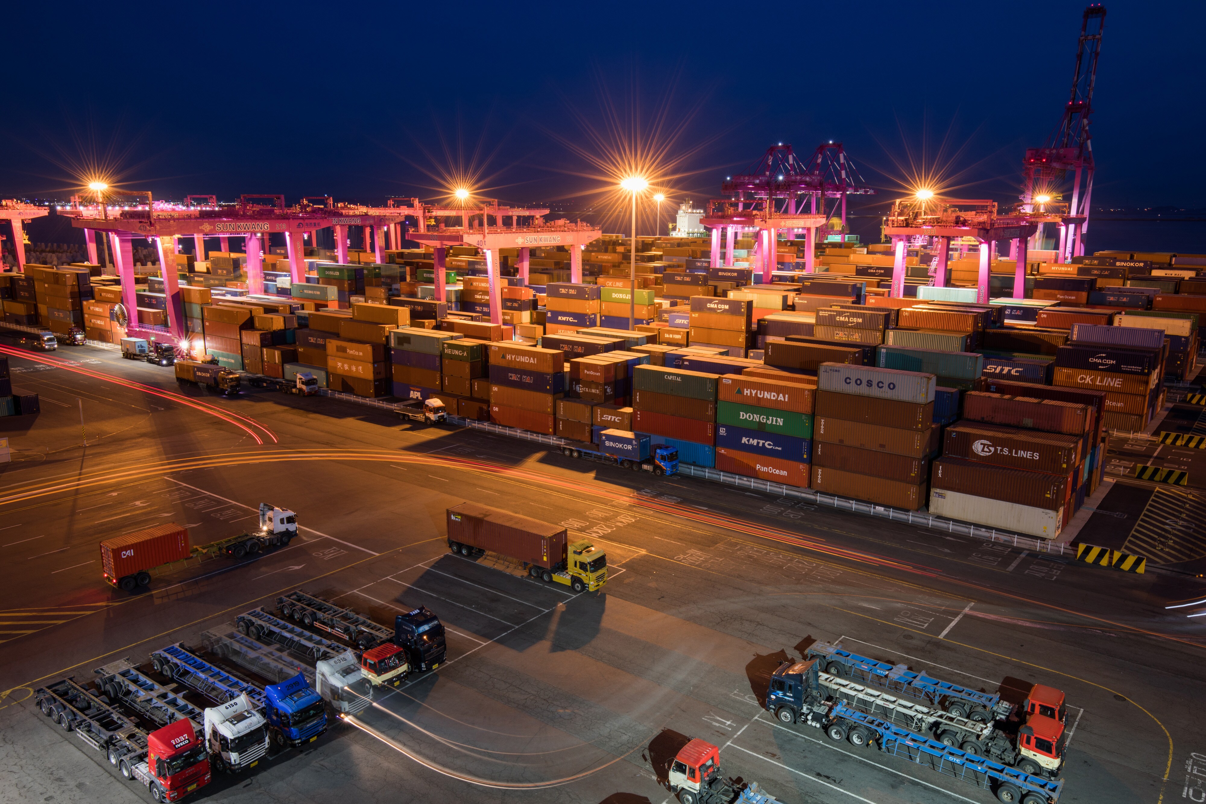 Containers sit stacked beneath gantry cranes at a port. (Photographer: SeongJoon Cho/Bloomberg)