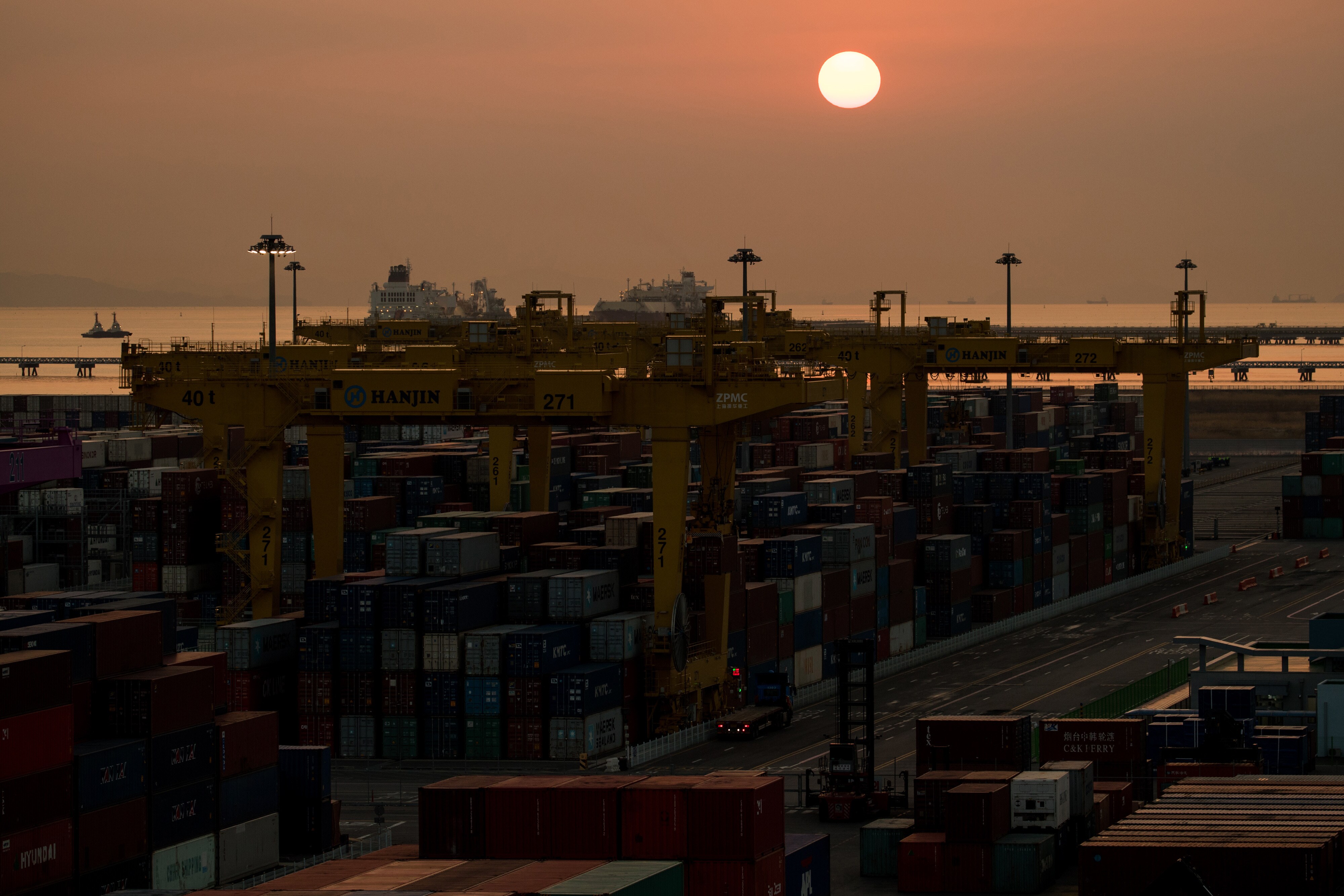 Containers sit stacked beneath gantry cranes (Photographer: SeongJoon Cho/Bloomberg)