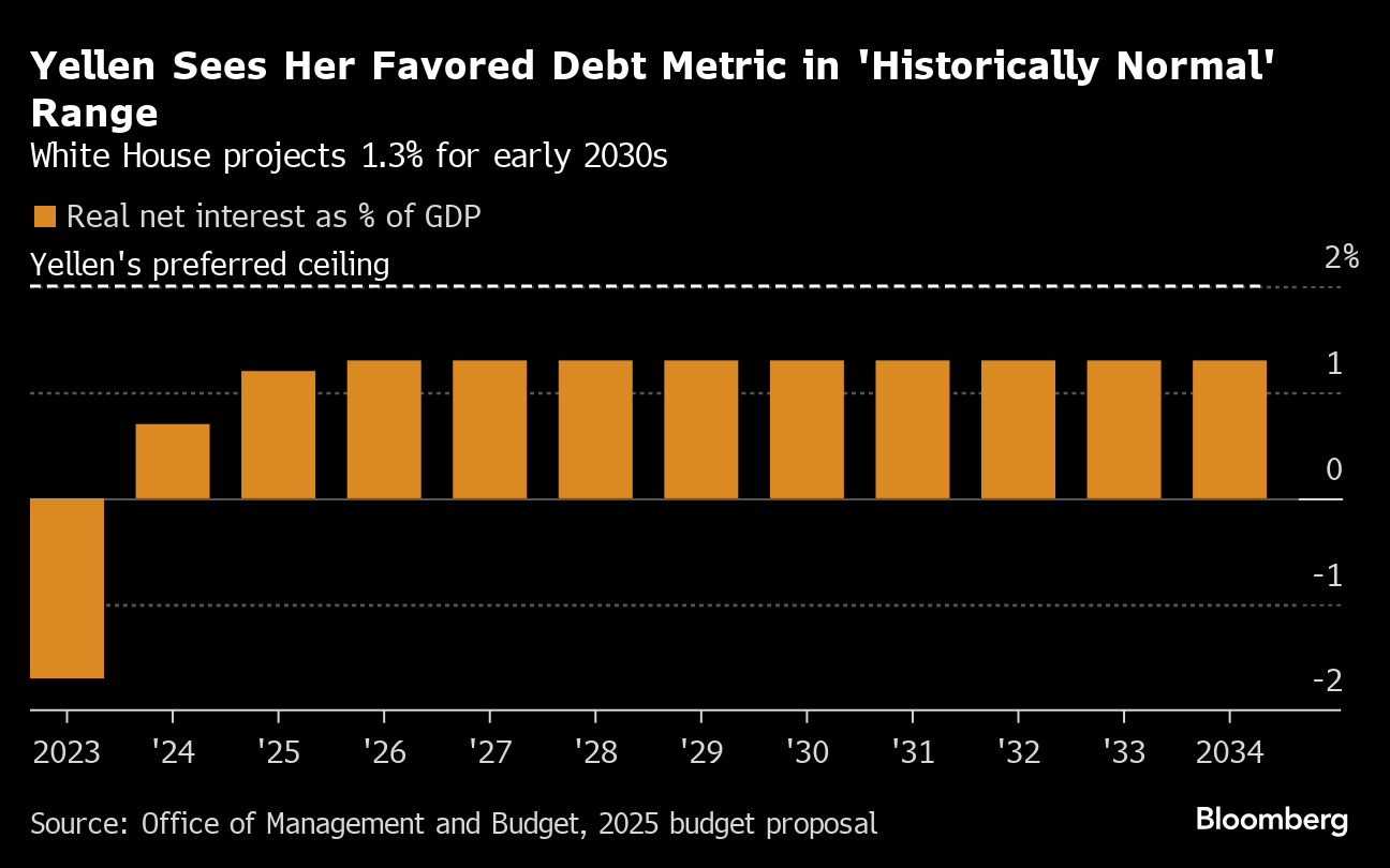 “We have included a lot of deficit reduction measures in the budget in order to hold the interest expense at a level that we think is fiscally responsible,” Yellen said. She was speaking with Bloomberg News in Stresa, Italy, on the sidelines of a Group of Seven meeting for finance ministers and central bank governors.