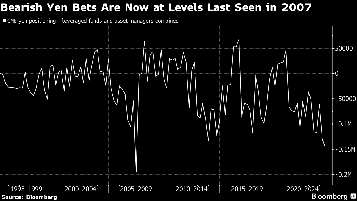 The combined short yen bets from leveraged funds and asset managers has reached a 17-year high. That stretched positioning leaves the currency bears vulnerable to “modest shocks in the opposite direction,” the strategists said.