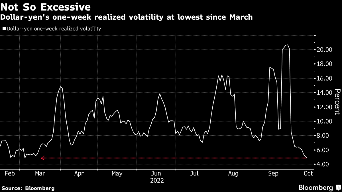 Still, evidence for the Japanese government's reasoning behind stepping into the market last month looks less compelling at the moment. One-week historical volatility in the dollar-yen has fallen to its lowest since March, indicating recent moves are far from extreme.