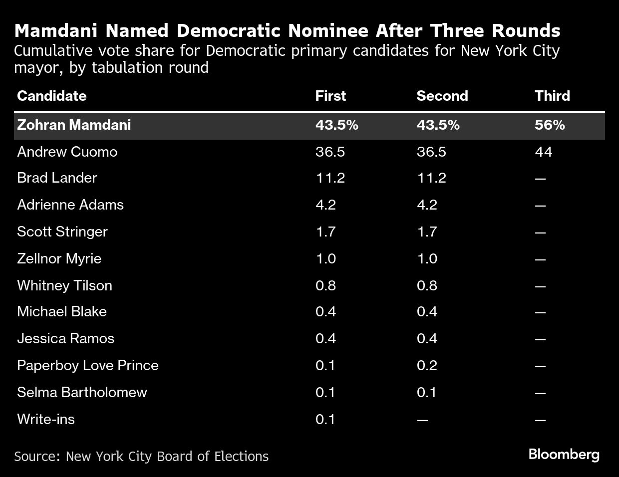 The ranked-choice tabulations released by the city Board of Elections on Tuesday showed Mamdani with 56% of the vote after after lower-ranking candidates were eliminated. Cuomo garnered 44%. After the polls closed on June 24, Mamdani had a 7-point lead. The city uses a preference voting system that allows votes for the eliminated candidates to transfer until one candidate gets a majority.